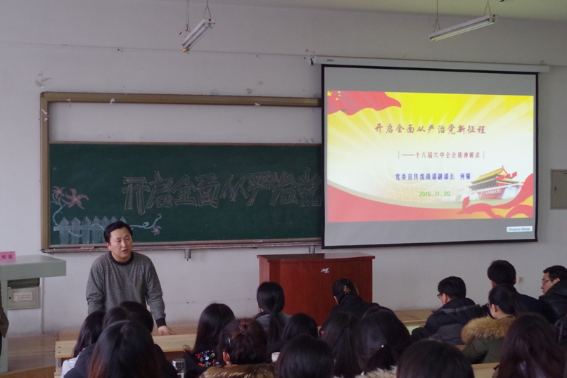 为深入学习贯彻党的十八届六中全会精神,按照学校党委《关于学习宣传党的十八届六中全会精神的通知》要求和日程安排,2016年11月30日14:30,由研究生部党委组织,邀请学校宣讲团成员、党委宣传统战部副部长、硕士生导师何强教授做了题为“开启全面从严治党新征程”的专题辅导报告。研究生部全体教师和学生党员参加了宣讲会,会议由研究生部党委书记滕永富主持。