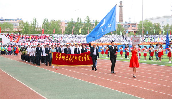 在开幕式上,由研究生学院院长刘喜军教授带队的共7名教职工及63名研究生组成检阅方队接受主席台检阅,他们迈着整齐的步伐、意气风发地走过主席台,“勤学修德,筑梦研途;青春无畏,逐梦扬威”的口号,整齐而响亮,向齐齐哈尔大学全校师生展现了我校研究生刻苦钻研、努力创新、勇于拼搏的精神风貌。